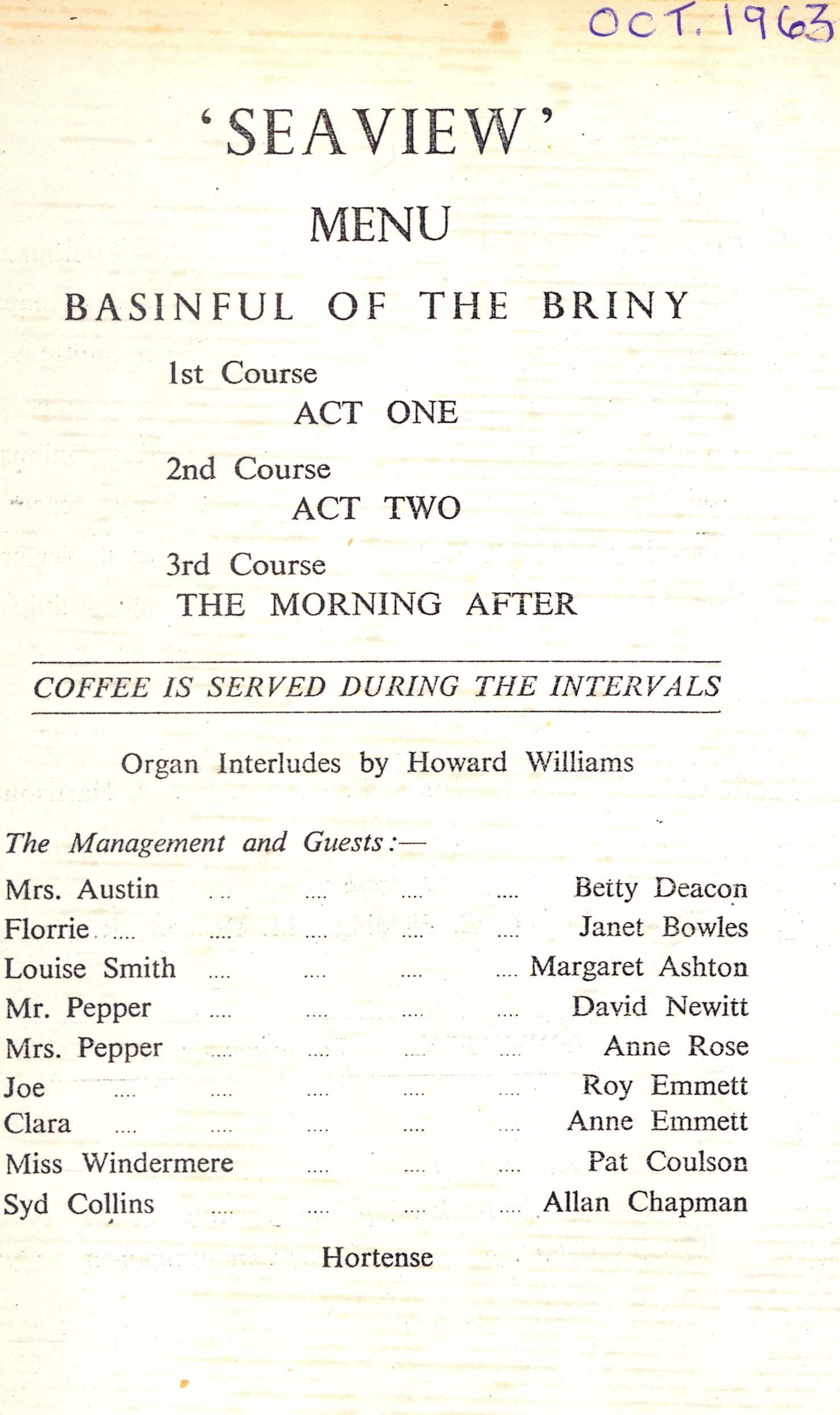 A basinful of mishaps and misunderstandings occur in the second of Leslie Sands' 'Seaside Trilogy'. When Mr and Mrs Pepper return to the 'Seaview Guest House' to celebrate their 1st Anniversary, not only do they once again encounter the dragonish proprietress Mrs Austin, but are surprised by the unexpected arrival of their interfering in-laws and are driven to distraction and separation by the glamorous Miss Windermere. Together, this unlikely gathering stumble across a couple of small-time crooks and set out to foil their dastardly capers and win the day. An Anniversary for Mr and Mrs Pepper to remember - and a play the audience will not easily forget!