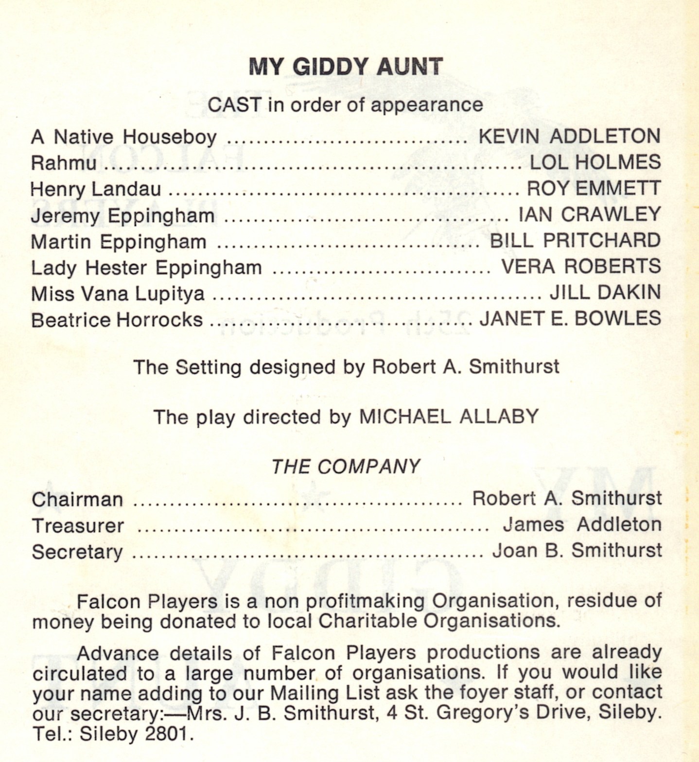 Set in LADY EPPINGHAM'S house in India, this play has all the superb comedy that one would expect from the masters of farce, plus a good measure of thrills. The eccentric but aristocratic LADY EPPINGHAM lives in a world of fantasy and past glory of the Empire, while the running of her tea estate is left in the hands of her unscrupulous nephews. But when BEATRICE HORROCKS, LADY EPPINGHAM'S half-sister of decidedly lowly birth arrives to claim her right to manage the estate, the situation changes and in a series of hilariously funny scenes, she slowly but surely sorts everything out and unmasks the schemes of her nephews